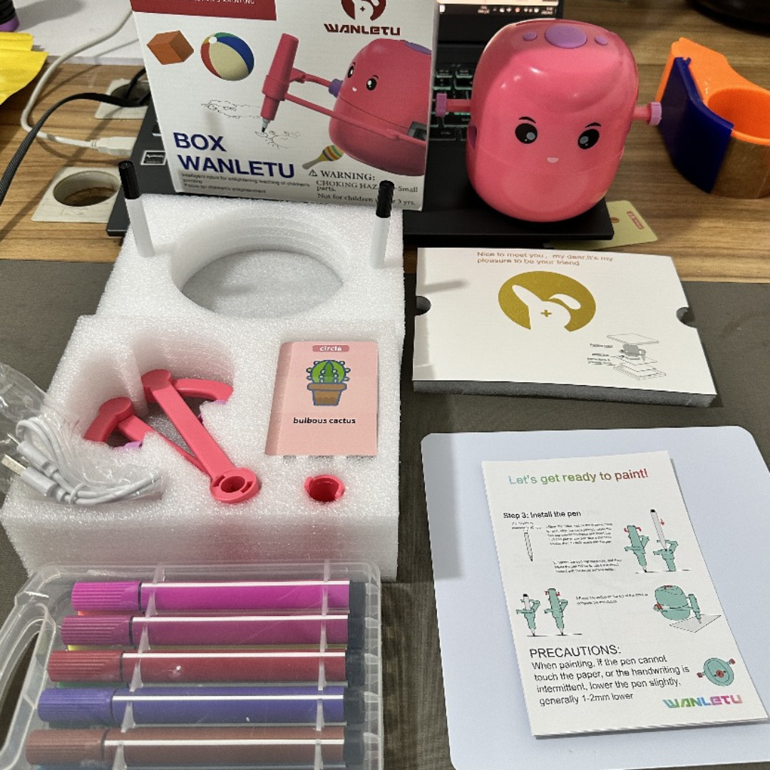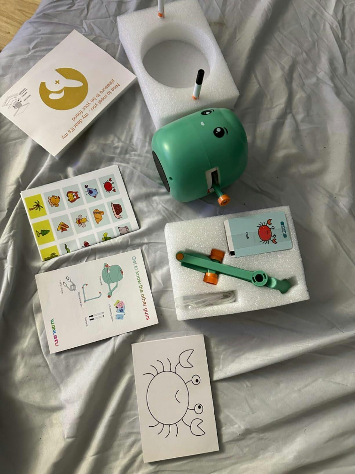 You receive the robot, drawing arm and pen holder, learning cards, pens, a drawing board or mat, a USB charging cable and an easy-to-follow user manual.