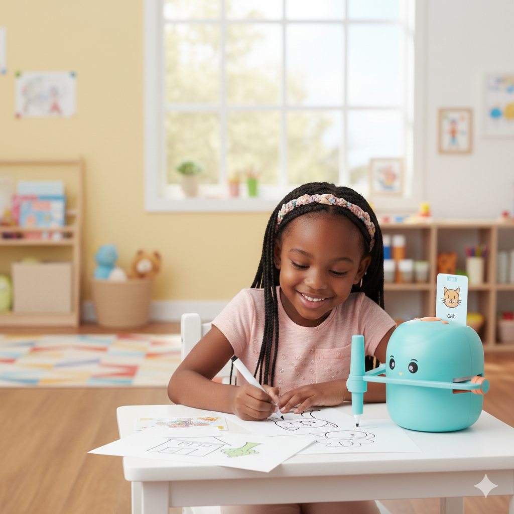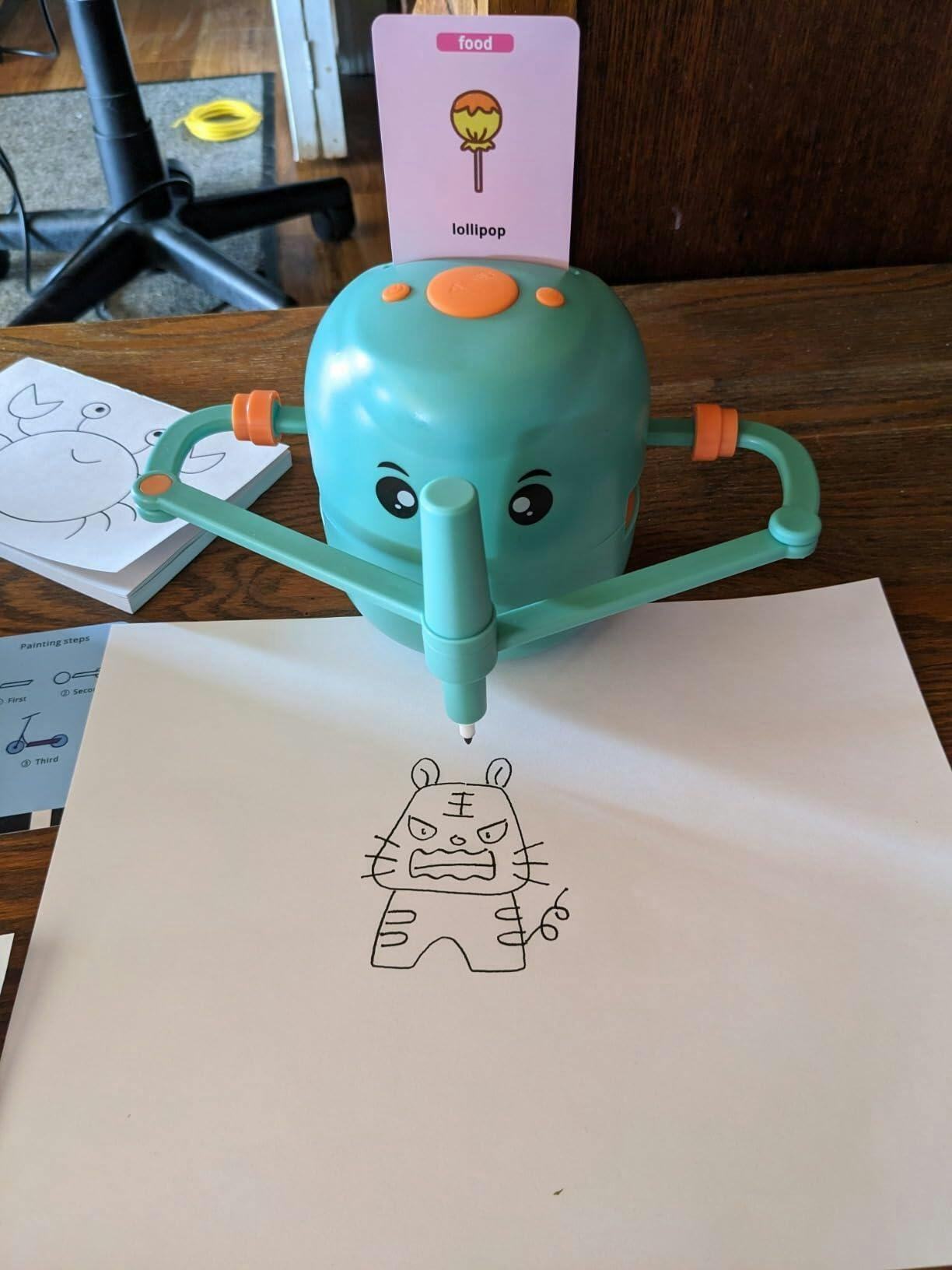 It’s an intelligent drawing robot that teaches children how to draw. Kids insert a learning card, watch the robot move the pen, and follow the same strokes on their own paper.