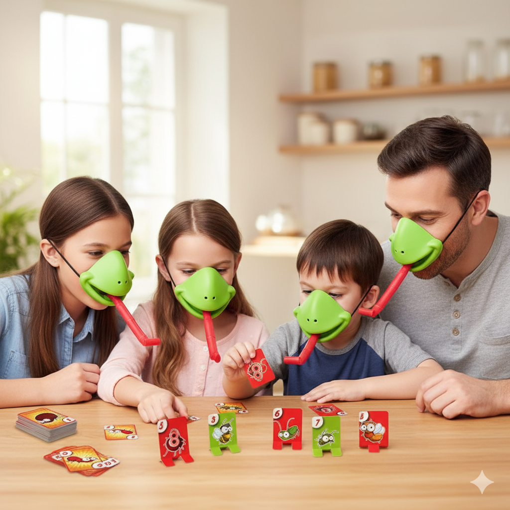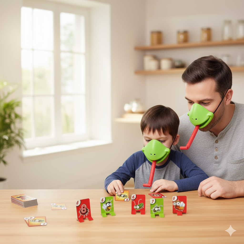 It’s a fast-paced family game where players wear frog masks and use extendable “tongues” to catch numbered bug targets.