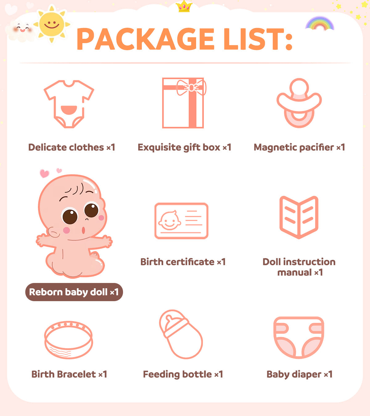 Each baby comes with clothing, a gift box, baby bottle, pacifier, birth certificate, and a small surprise gift. Everything arrives ready to gift and beautifully presented.